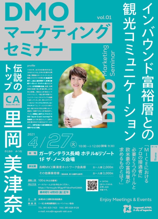 長崎市の観光推進を目的としたDMOマーケティングセミナーの第1回目として、長崎MICE誘致推進協議会(事務局:(一社)長崎国際観光コンベンション協会)の主催で、「インバウンド富裕層との観光コミュニケーション」を開催致します。