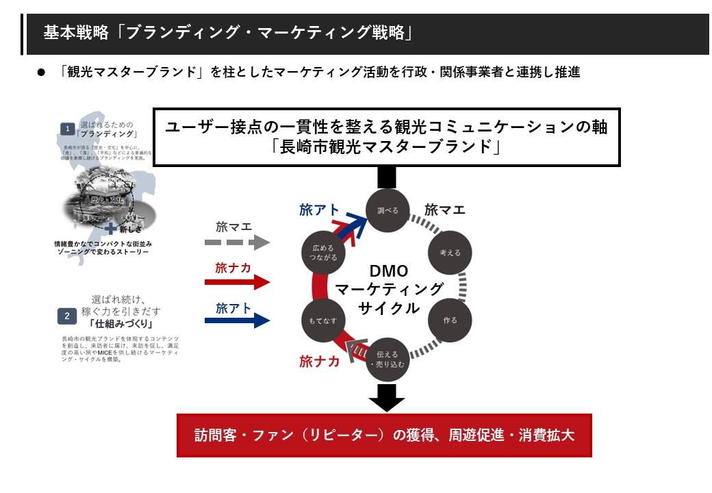 基本戦略とましては、ユーザー接点の一貫性を整える観光コミュニケーションの軸となる「長崎市観光マスターブランド」を構築し、訪問客の旅行消費行動(トラベルライフサイクル)である旅マエ、旅ナカ、旅アトの流れに即した戦略的なマーケティング活動(=DMO NAGASAKIマーケティングサイクル)によって、