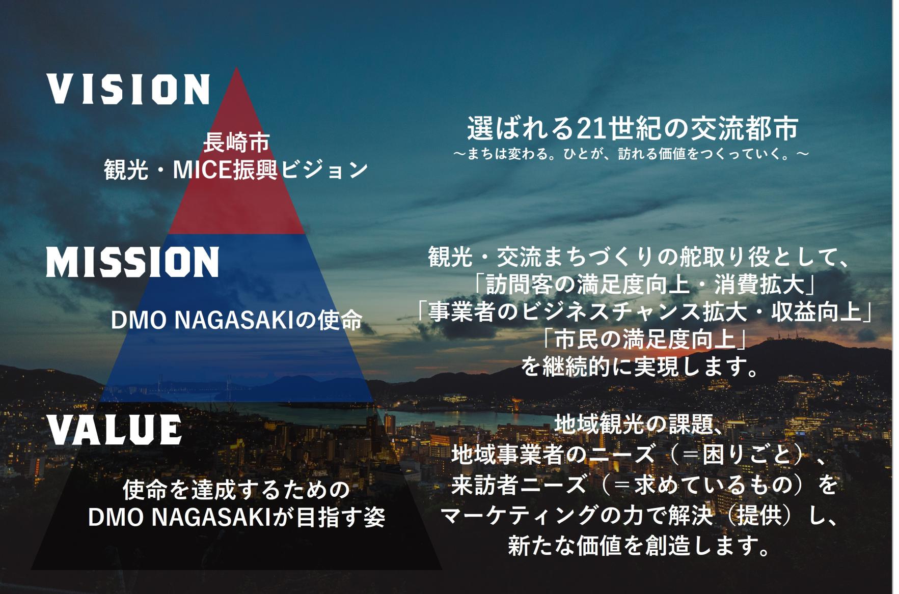 私たちは、「長崎市観光・MICE戦略」の基本方針である「選ばれる21世紀の交流都市」を実現するための舵取り役として、「訪問客の満足度向上・消費拡大」、「事業者のビジネスチャンス拡大・収益向上」、「市民の満足度向上」を使命に、データに基づく各種の事業を関係事業者の皆さんと一緒に進めて参ります。