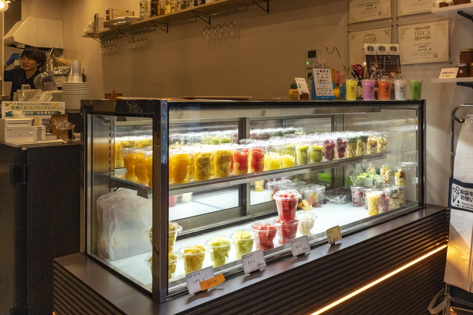 ショーケースには色とりどりの季節のカットフルーツが並んでいます