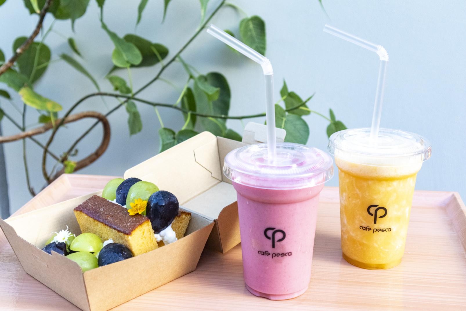 テイクアウトで注文可能な「フレッシュフルーツスムージー」と「カステラフルーツサンド」