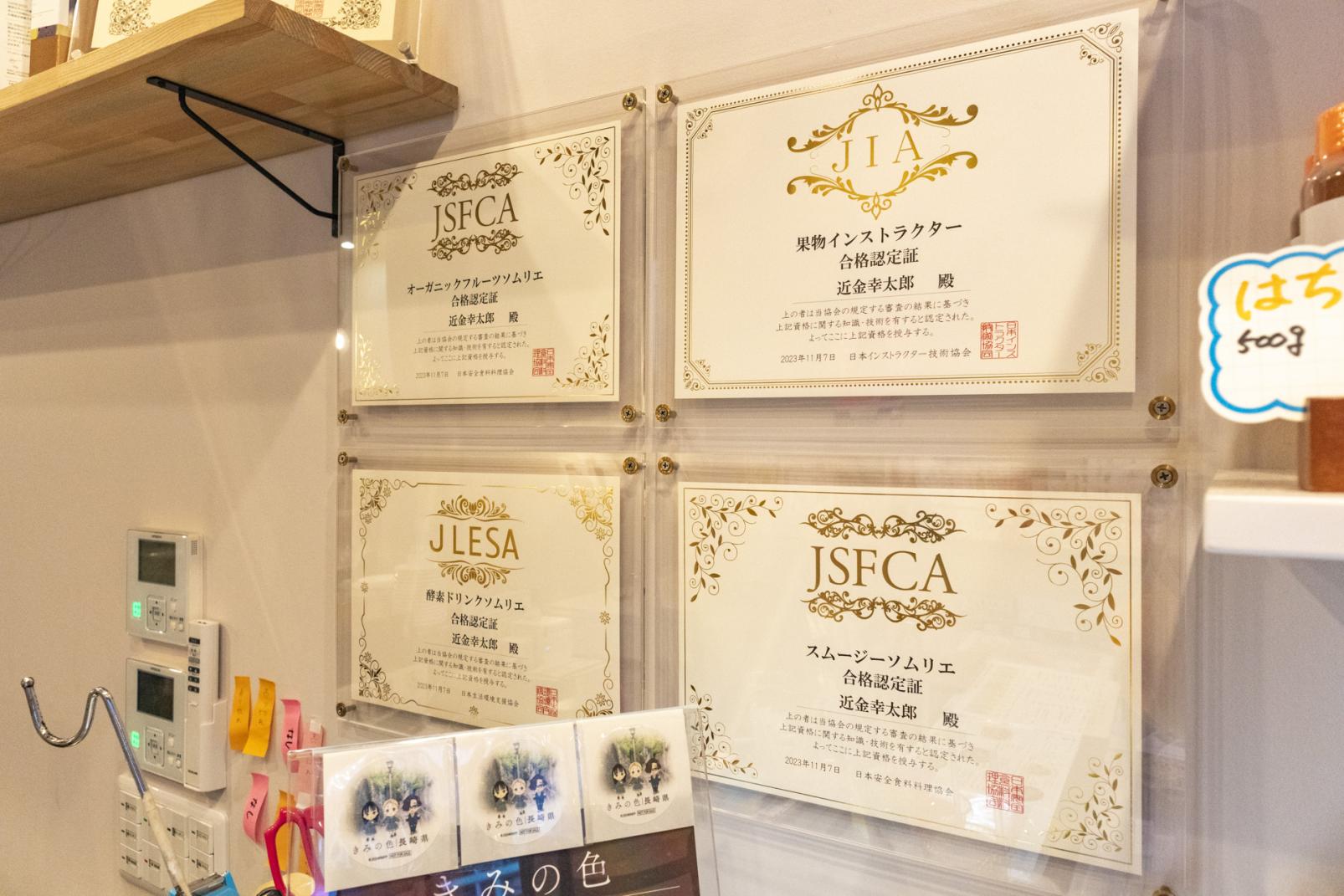 オーナーで果実店次期6代目の近金幸太郎さんは、フルーツソムリエや果物インストラクターなど果物に関わる多様な資格を取得済