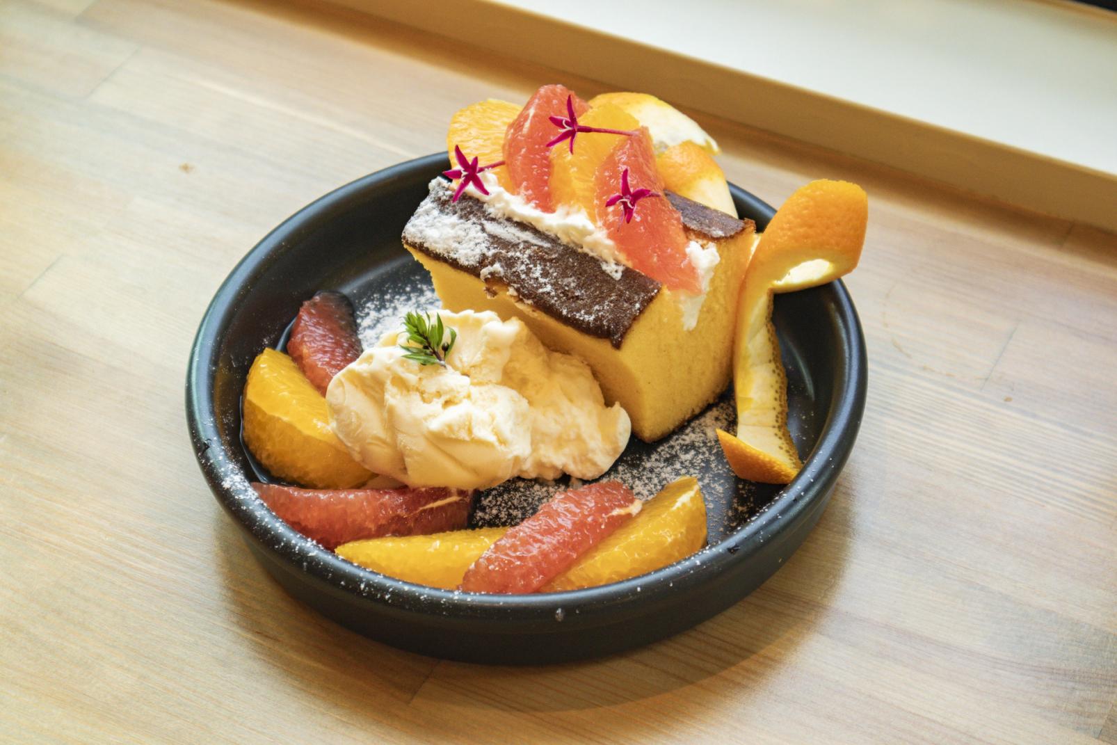 「カステラフルーツサンド」は季節に応じ、トッピングのフルーツが変わるため、何度でも訪れたくなります