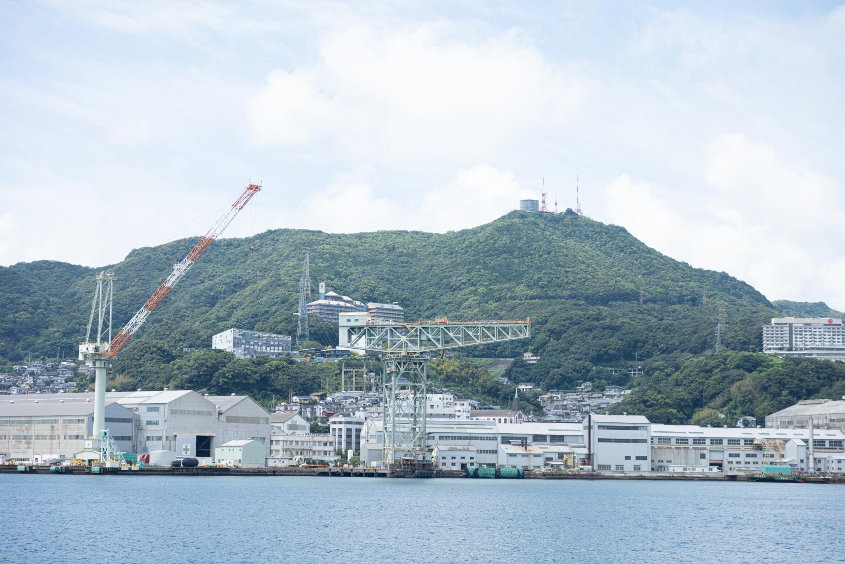 出航後、最初に見えてくる世界遺産は「ジャイアント・カンチレバークレーン」。150tの吊り上げ能力があり、約110年間現役で活躍し続けています。「三菱長崎造船所 第三船渠」も、現役で使われている世界遺産。1905(明治38)年の完成当時は東洋一のドックとして知られていました。ほかにも江戸時代前期にキリシタンが潜伏していたという神ノ島では、禁教令が解かれたあとに建立されたという神ノ島教会や、高さ4.7mのマリア像も船上から見ることができます。