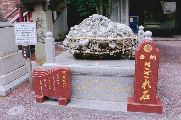場所は社殿の脇。日本の国家「君が代」の歌詞の一節に「さざれ石の巌となりて……」とありますよね。小さな石(さざれ石)が、長い年月をかけて大きく固結してできた霊石です