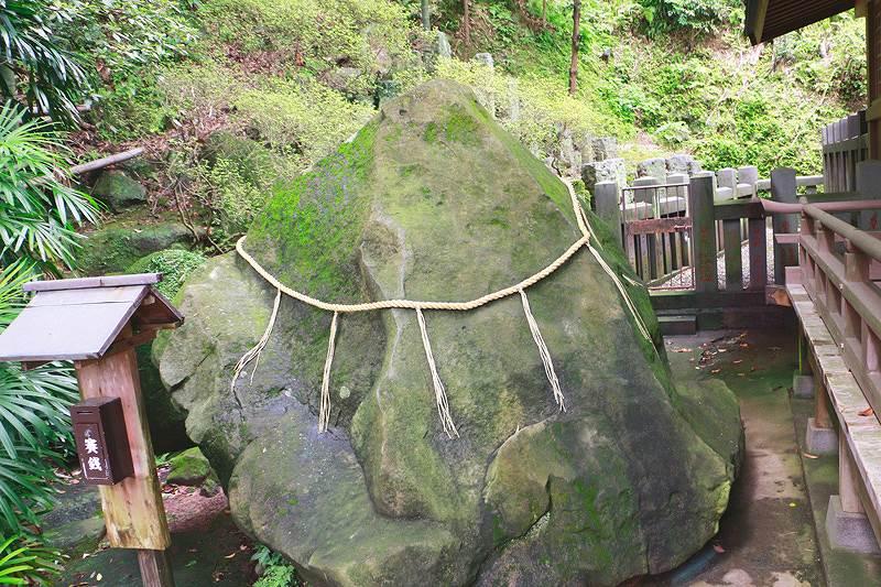 玉園稲荷神社のお社の左隣に祀られている大きな岩。その形から「かえる岩」や「どんく岩」と呼ばれています。「どんく」とは長崎弁で「かえる」の意味。1982(昭和57)年の長崎大水害が起きた際、本殿への土砂をくい止めてくれたということで、災難除けとしても信仰されているのだそう