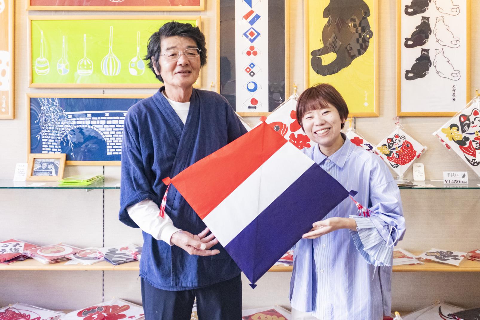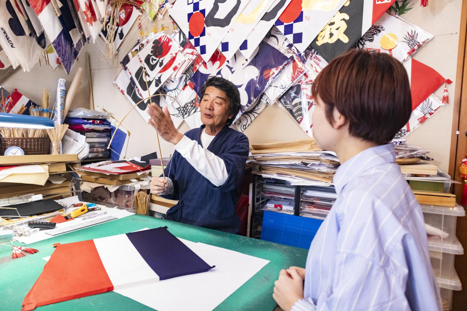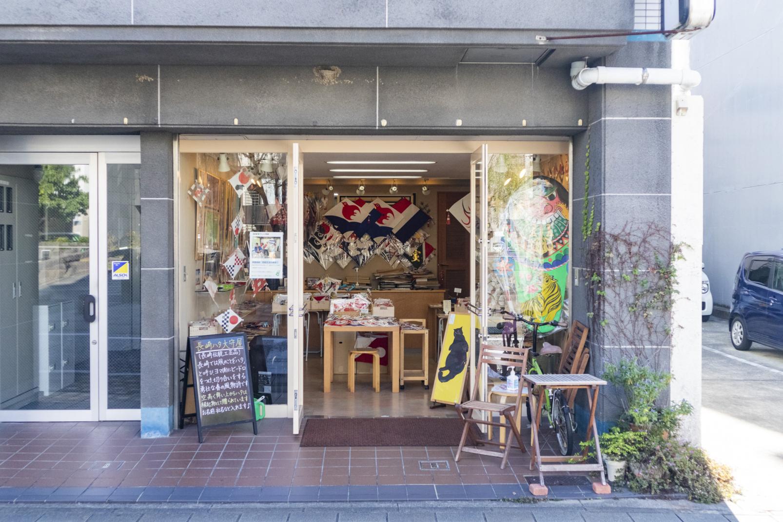 小さい頃からずっとハタで遊んでいた、という大久保さんが営む長崎の伝統工芸・長崎ハタの専門店「大守屋」さんでは、ハタづくりを体験できます。縦ボネと横ボネが十字になっていることや、赤、青、白が基本色になっている理由、柄自体の説明、バランスのとりやすいデザインになっていることなど、手順だけでなくハタに纏わる言われや歴史、物語などを話ながら丁寧に教えてくれます。実際に触れるとよくわかるのですが、柄や文字はすべて染色した手漉き和紙を切り貼りして出来上がったもの。実際に空に揚げることができる大型のものから、小さいサイズのオリジナルの縁起バタも店内に並び、学びとともにお土産も持ち帰ることができます。