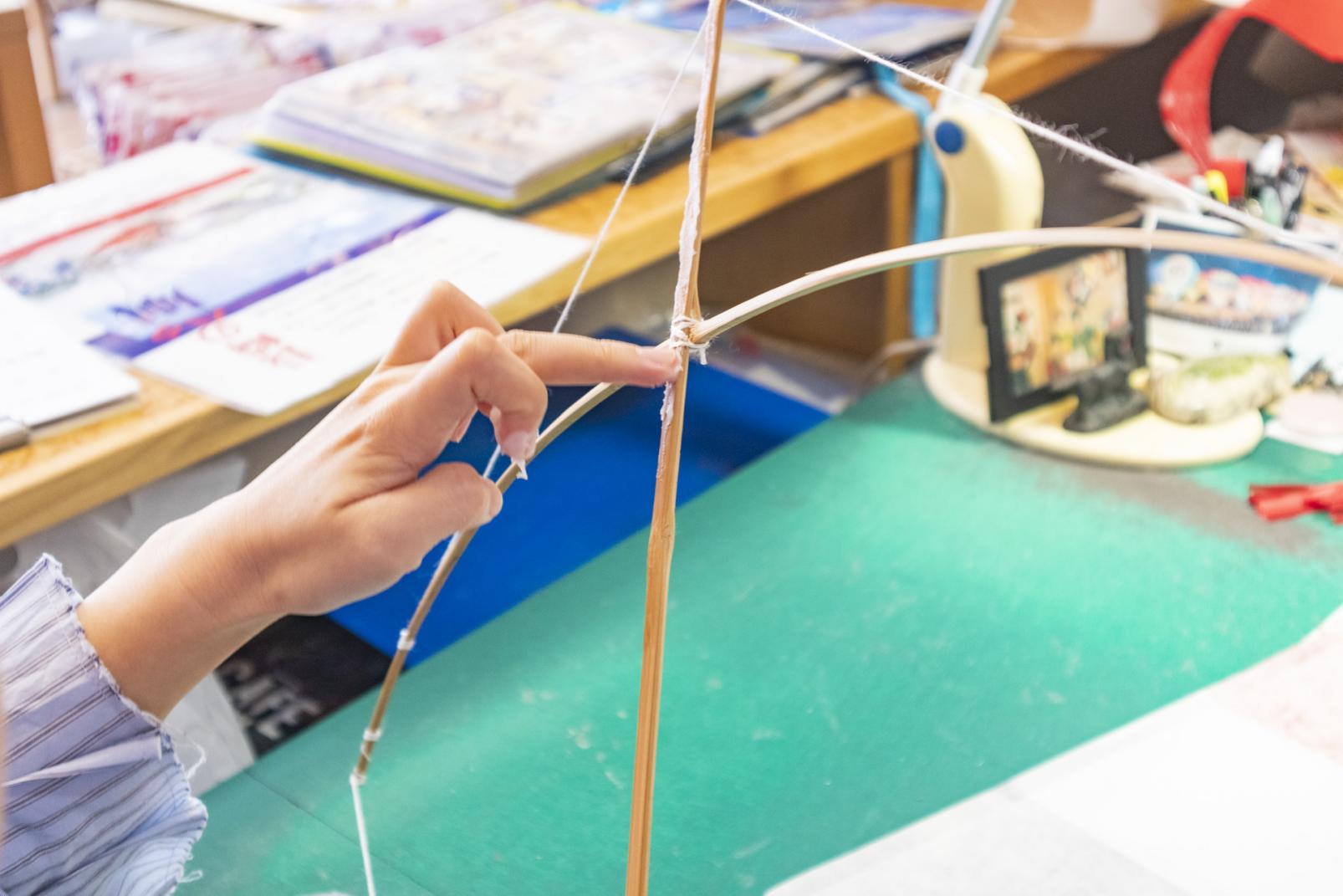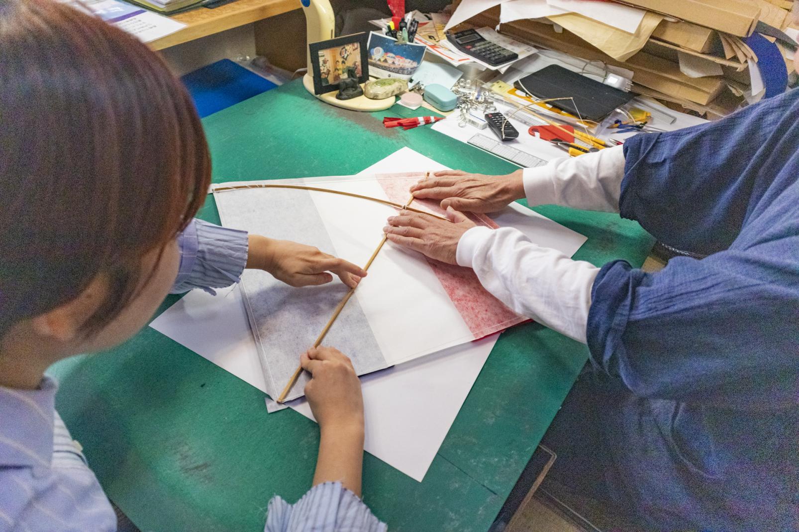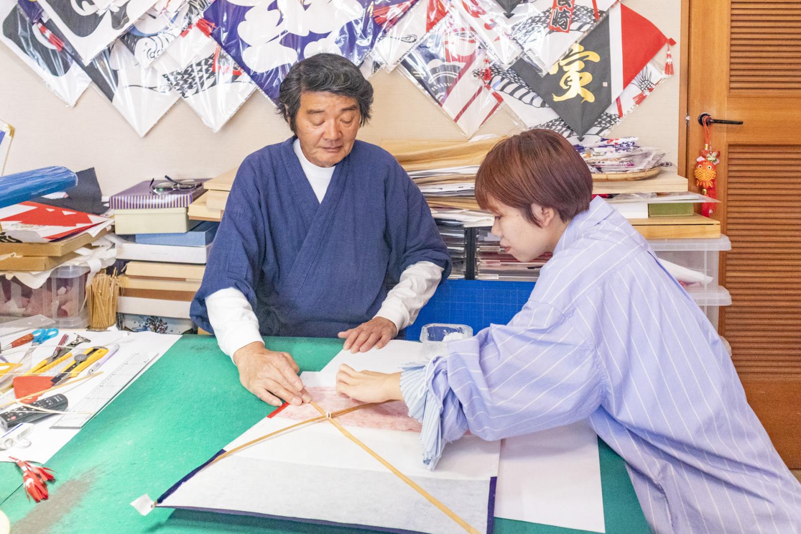 小さい頃からずっとハタで遊んでいた、という大久保さんが営む長崎の伝統工芸・長崎ハタの専門店「大守屋」さんでは、ハタづくりを体験できます。縦ボネと横ボネが十字になっていることや、赤、青、白が基本色になっている理由、柄自体の説明、バランスのとりやすいデザインになっていることなど、手順だけでなくハタに纏わる言われや歴史、物語などを話ながら丁寧に教えてくれます。実際に触れるとよくわかるのですが、柄や文字はすべて染色した手漉き和紙を切り貼りして出来上がったもの。実際に空に揚げることができる大型のものから、小さいサイズのオリジナルの縁起バタも店内に並び、学びとともにお土産も持ち帰ることができます。