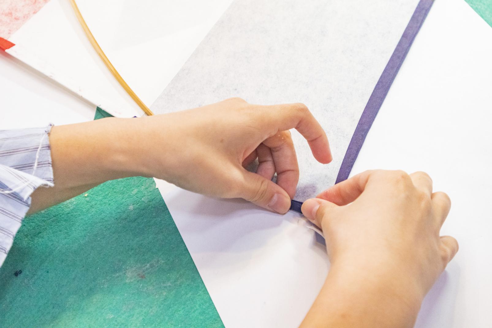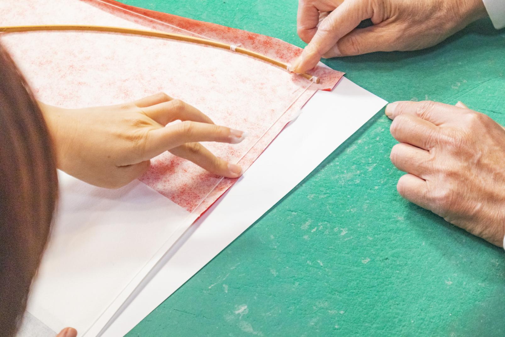 裏返した和紙に位置をよく確認しながら、軽く押しつけ、表からも指の腹で縦ボネに沿って優しくなぞります