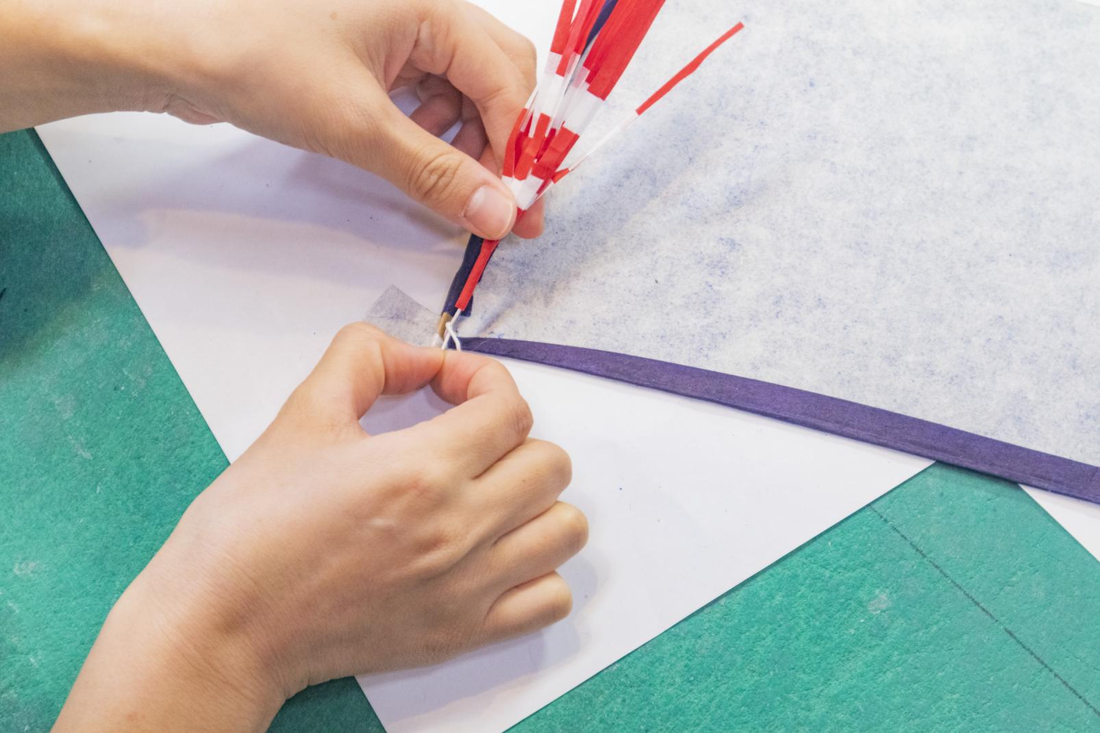 組み立て済みの縦ボネ、横ボネと、カット済みの和紙を準備してくれているので手軽に体験できます。今回は約45cmサイズ、柄はオランダ国旗。赤と白と青の和紙をのりで繋ぎ合わせています