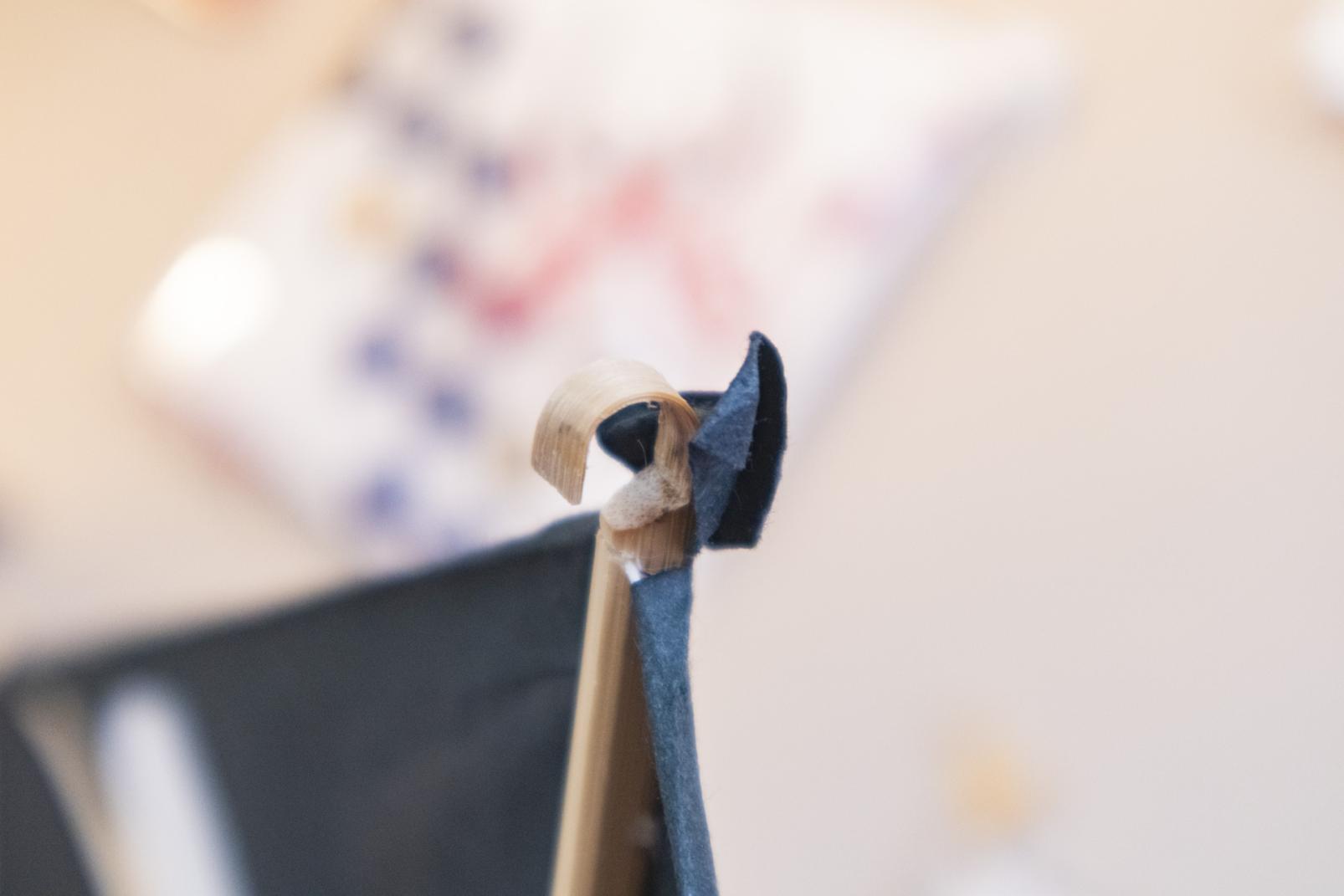 ハタには縦ボネの上部先端にフックがついているので、飾る時に重宝します。ハタ揚げをするときは、逆さまにして地面にトンと軽く打ちつけ折るそうです