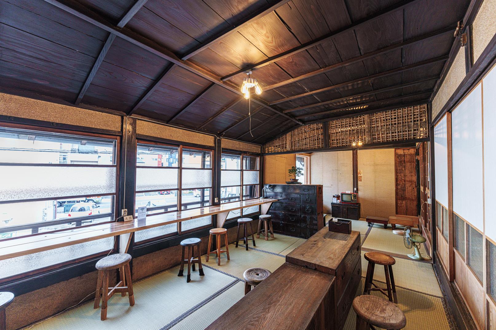 リノベされた上質な雰囲気の中に古い家具やブラウン管の懐かしいテレビがノスタルジックな2階のカフェスペースは、のんびり外を眺めながら過ごすことができます