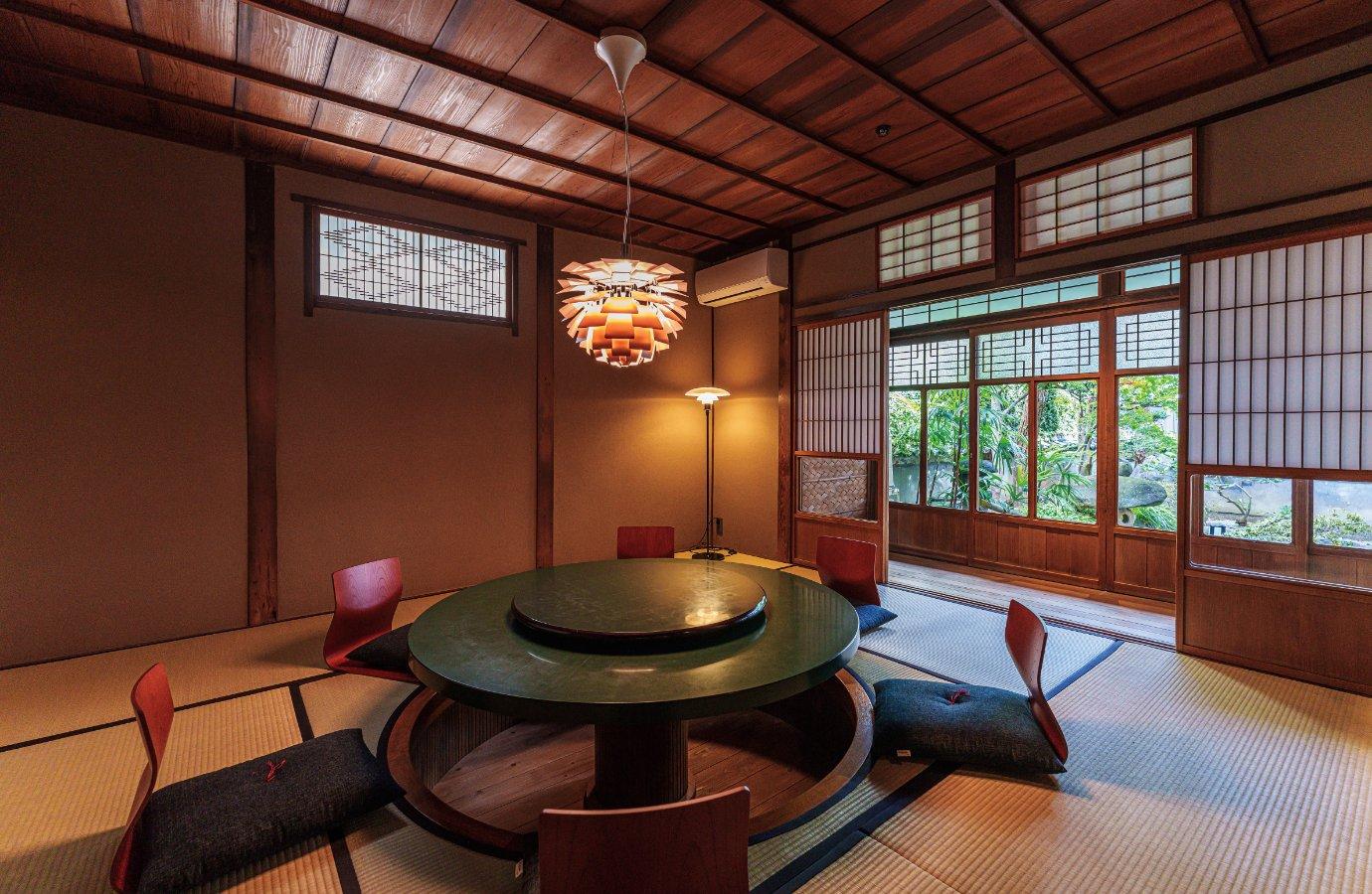 中華料亭時代を伝える丸い円卓(4名〜利用時)。坪庭の景色も楽しめる一室