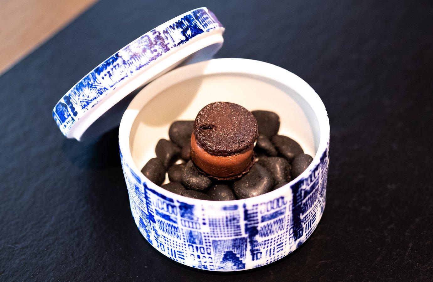ランチコース一品目(先付)は定番の チョコレートガナッシュでサンドした「フォアグラのムース」