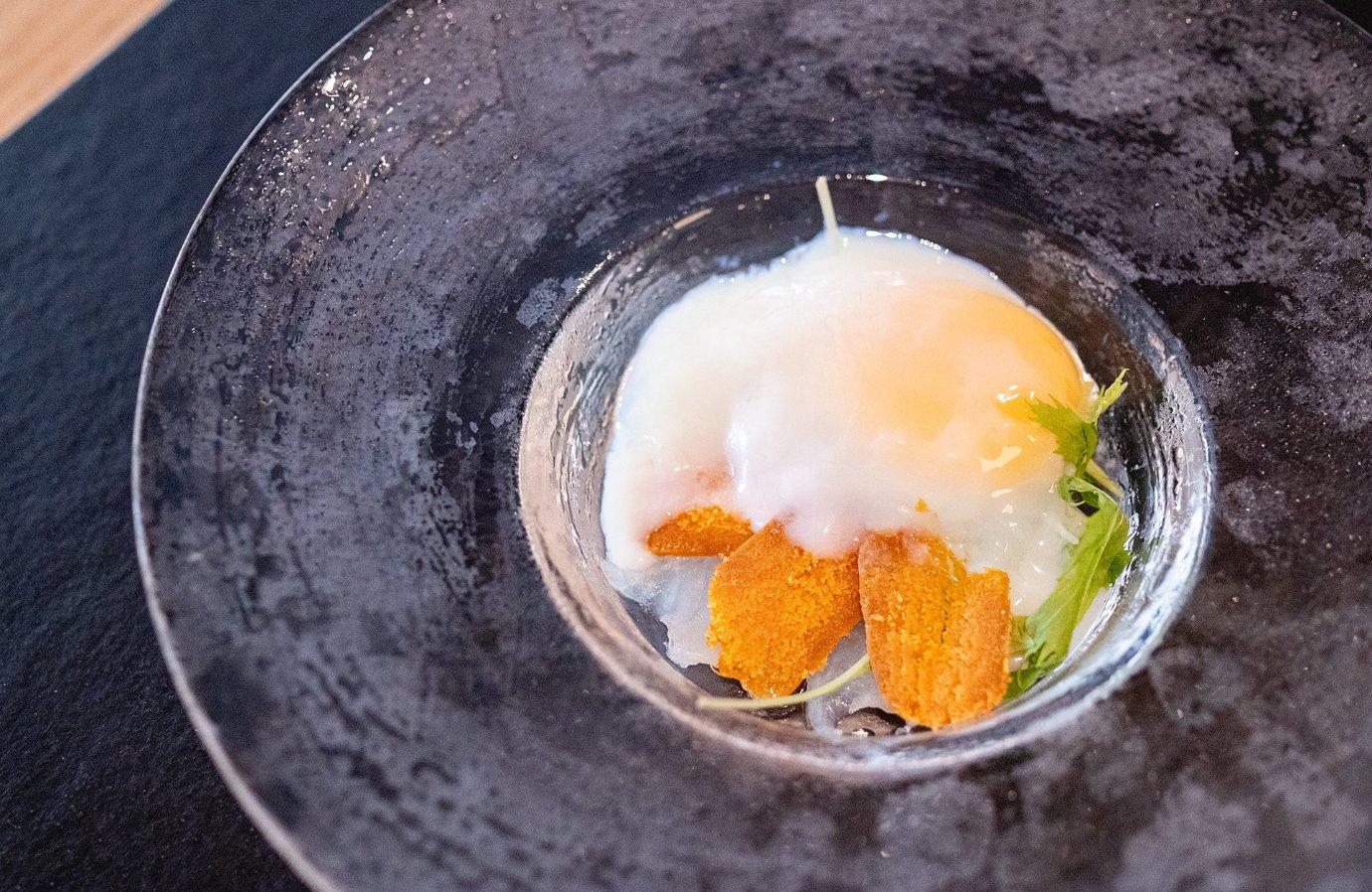 長崎名産のカラスミが乗った「しまあじのサラダ仕立て 温泉卵とボッタルガ添え」