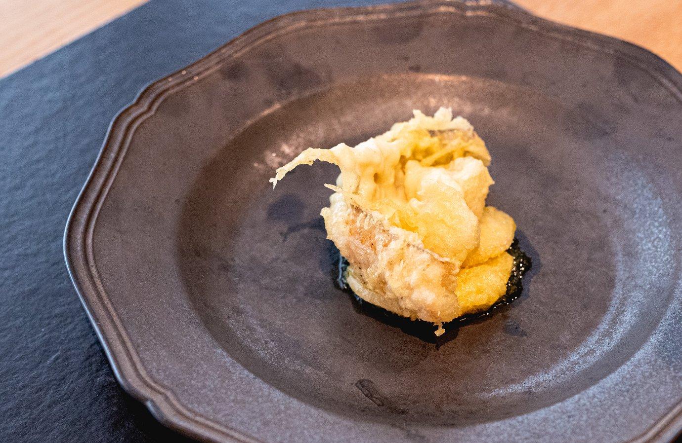 トップに玉ねぎのムースがかかった「太刀魚のフリット 大葉のジェノベーゼ」