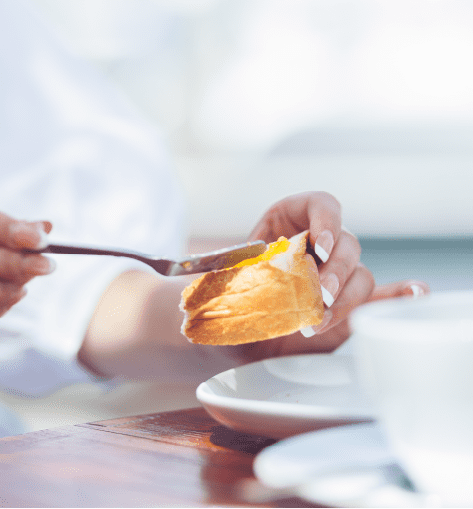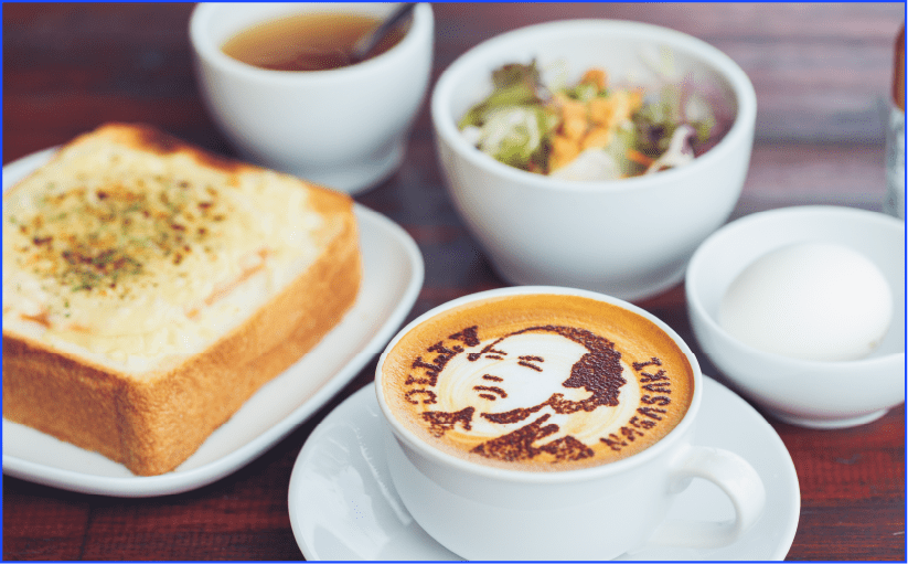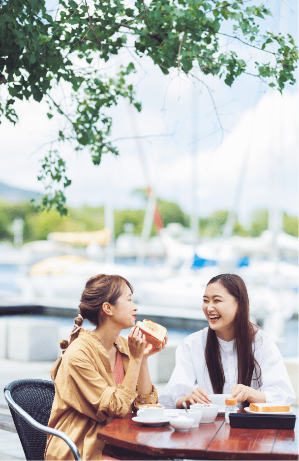 海の見えるテラス席で、優雅にブランチ。なんだか日本じゃないみたい。かわいい龍馬のカフェラテは隠れメニューなのに、口コミが広がって10年以上オーダーされ続けてる人気メニューなんだって。