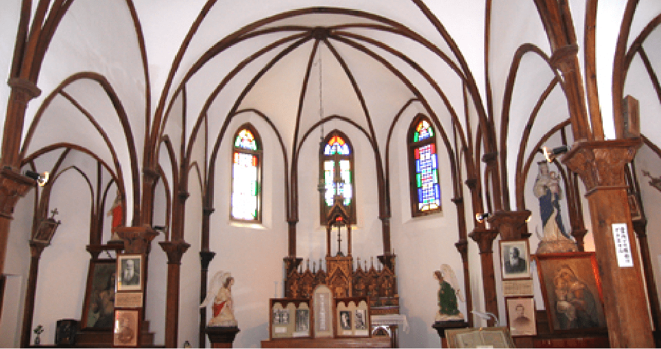 中に入るとアーチ状の天井、ステンドグラスから差し込む光がとってもきれいだった。