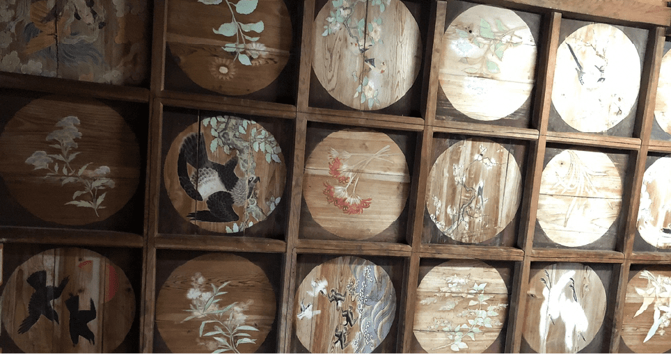 本堂の天井に、121枚もの極彩色の花鳥画。圧巻でしばらく見とれる。