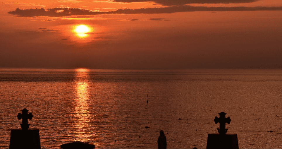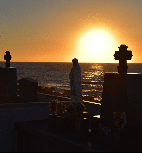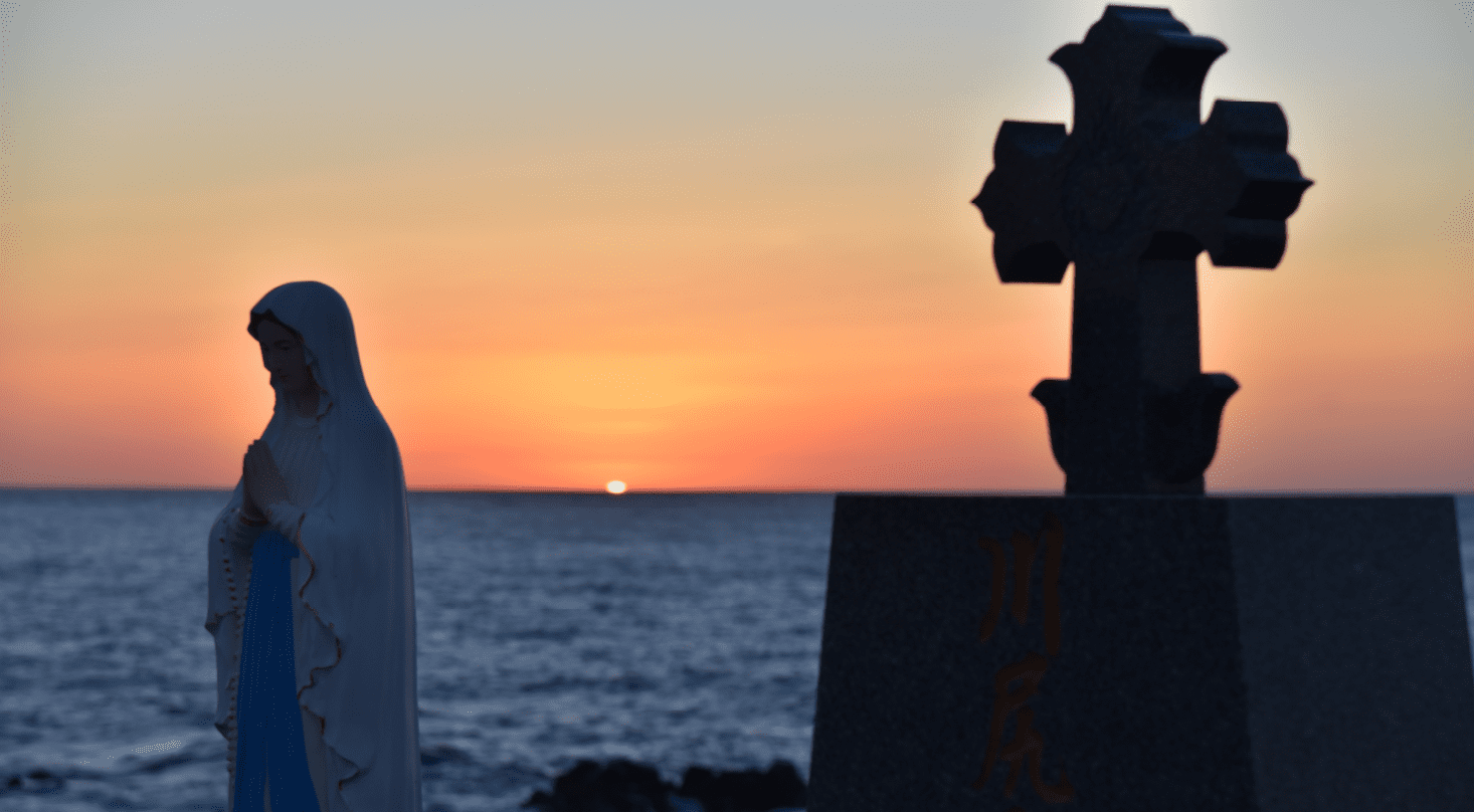 傾きかけた陽射しが、十字架の墓標やマリア像の頬を照らす。その向こうには幻想的な五島の海。